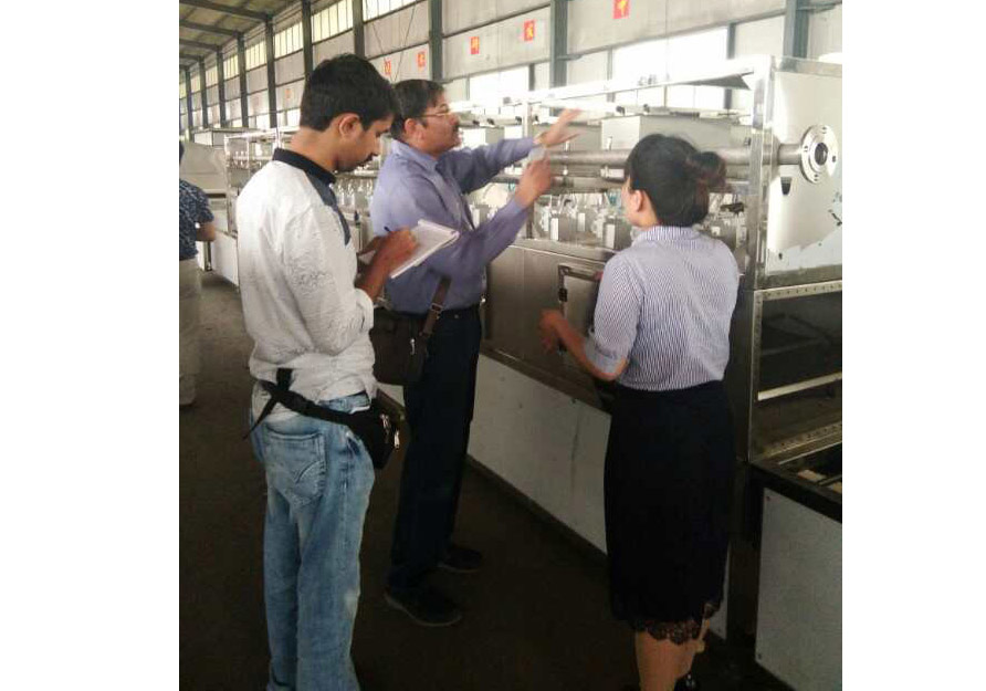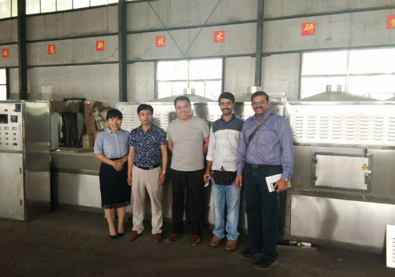 印度客戶在阿達(dá)森機(jī)械工廠參觀考察微波花生烘焙設(shè)備